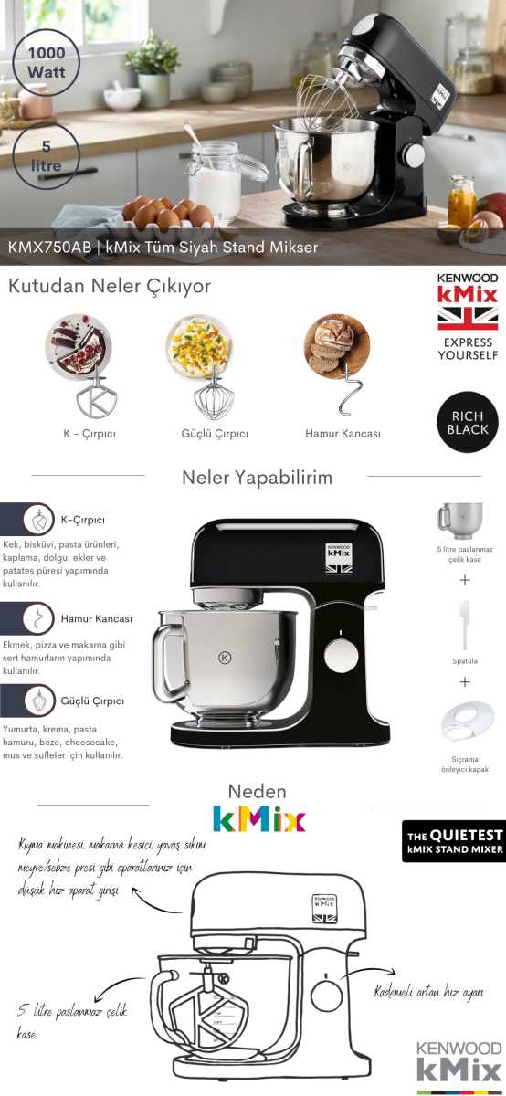 Kenwood KMX750AB Kmix 1000 Watt Tüm Siyah Mutfak Şefi